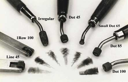 The patterns available are stipple (Dot) the most popular, and parallel line (Line). These patterns are available in the following gauge sizes: Course 45, Medium 65 and 85, Fine 100 & extra Fine 120. Only the 9Dot & 10Dot are available in 120 DPI